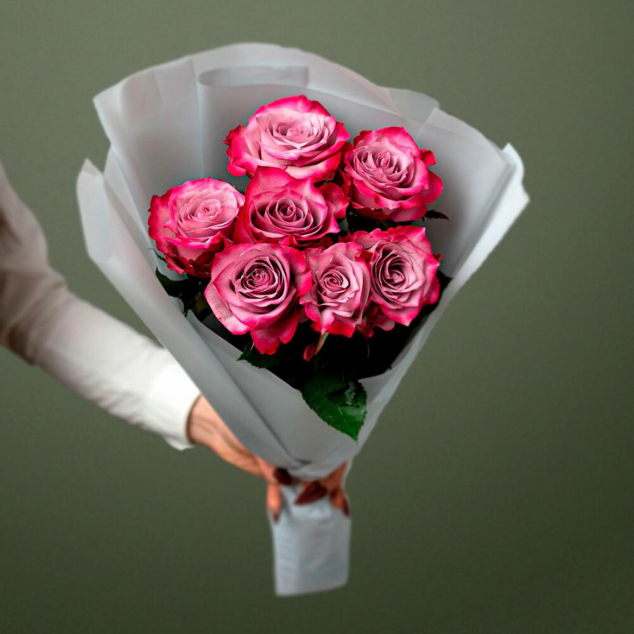 На фото букет из 7 фиолетовых роз. В составе: роза 7 шт, дизайнерская упаковка 1 шт, атласная лента 1 шт, . Все цветы свежие и ароматные, букет красиво оформлен и отлично подходит для подарка. Доступна доставка цветов или самовывоз.