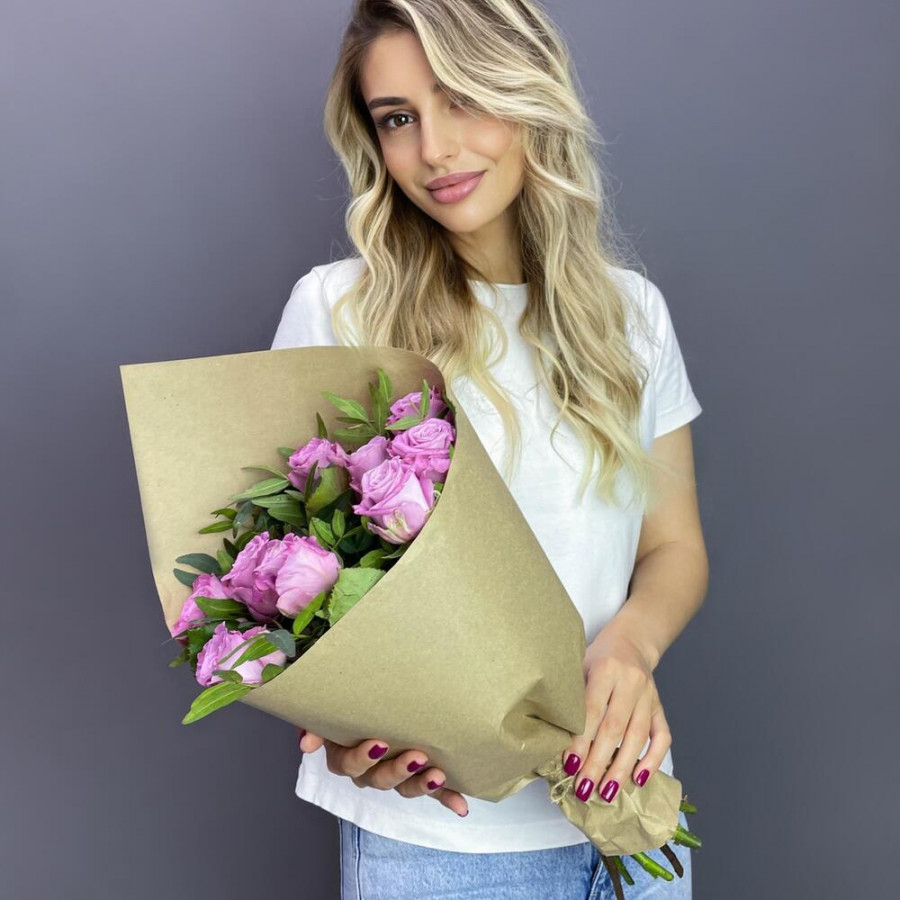 На фото букет из 9 сиреневых роз. В составе: роза 9 шт, писташ 3 шт, крафт-бумага 1 шт, атласная лента 1 шт, . Все цветы свежие и ароматные, букет красиво оформлен и отлично подходит для подарка. Доступна доставка цветов или самовывоз.