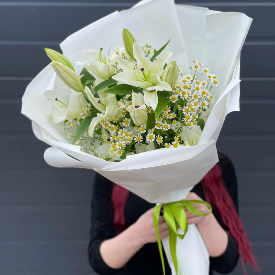 На фото букет «молочный шепот». В составе: лилия 3 шт, танацетум 5 шт, дизайнерская упаковка 1 шт, атласная лента 1 шт, . Все цветы свежие и ароматные, букет красиво оформлен и отлично подходит для подарка. Доступна доставка цветов или самовывоз.