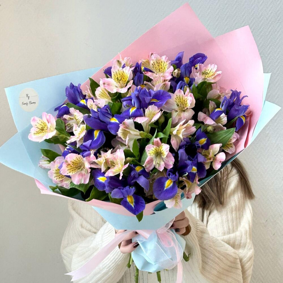 На фото букет «синие дали». В составе: ирис 15 шт, альстромерия 10 шт, дизайнерская упаковка 1 шт, атласная лента 1 шт, . Все цветы свежие и ароматные, букет красиво оформлен и отлично подходит для подарка. Доступна доставка цветов или самовывоз.