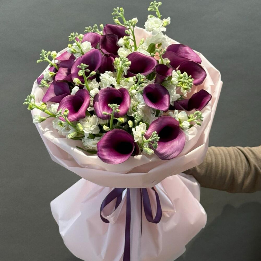 На фото букет «тайна полуночи». В составе: калла 20 шт, маттиола 5 шт, дизайнерская упаковка 1 шт, атласная лента 1 шт, . Все цветы свежие и ароматные, букет красиво оформлен и отлично подходит для подарка. Доступна доставка цветов или самовывоз.